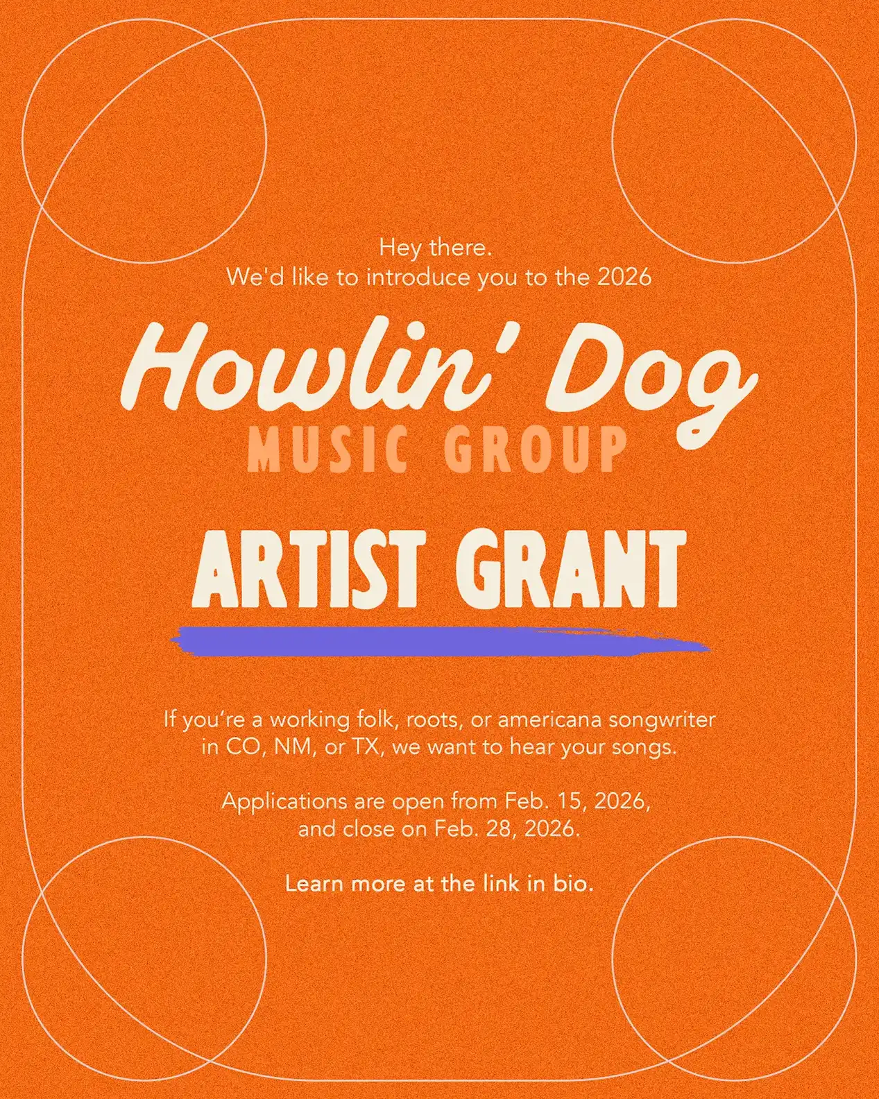 Howlin’ Dog Music Group is delighted to announce the application window for our 2026 round of funding for singer-songwriters ready to record original music. The application will be open February 15-28, 2026. At HDMG, we believe in the power of collective action to find new and sustainable ways to support the music we love and the artists who make it. Our mission is to create a new model of how to keep music alive and thriving because old avenues are no longer viable.